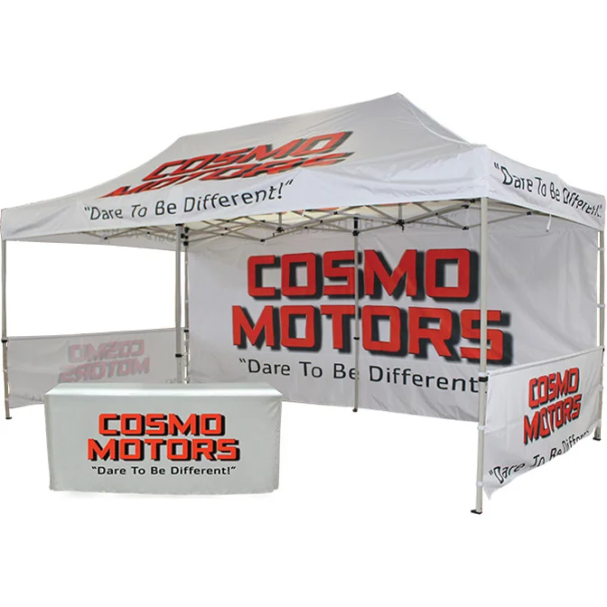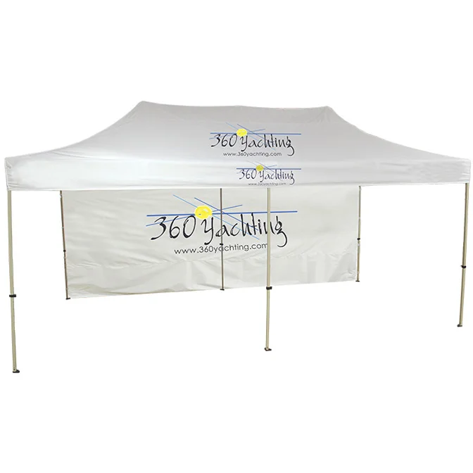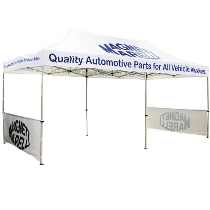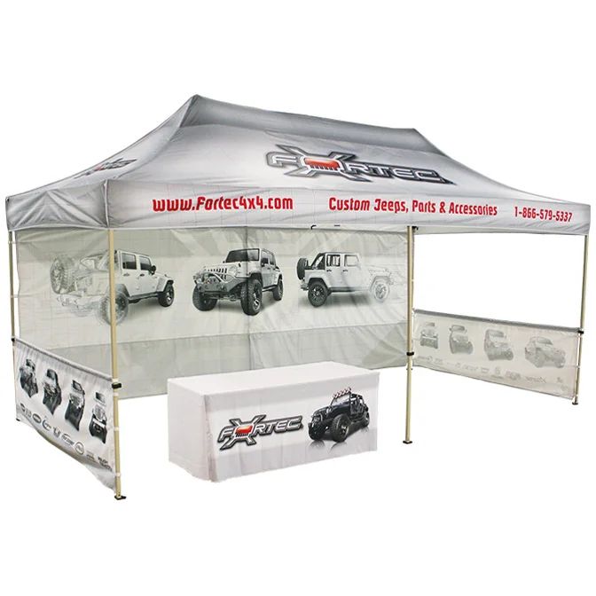 - 20' Fast Shade Backdrop, White with Full Color Logo. Backdrop attaches to the the inside of the canopy tent top with 1 inch hook and loop.