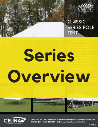 Celina's Classic Series Pole Tents are designed to be applicable to all types of events, due to the simple tensioning design. The tent top of a Classic Series Pole Tent is supported by center poles in the middle of the tent top, which are tensioned down to each of the corner and side poles. These poles are then anchored to stakes via ropes or ratchet assemblies, stabilizing the entire tent system or otherwise anchored for maximum stability.