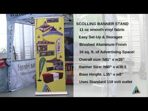 The Retractable Banner Stand allows for easy banner setup and tear-down; the banner is rolled into the base when not in use to maximize storage space. The brushed aluminum base supports 16 square feet of advertising space printed on 11 oz. smooth vinyl fabric, and when collapsed fits into the padded carrying case with a shoulder strap for simple transport.